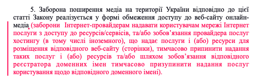 То есть, в случае, если сайт нарушит вышеупомянутые ограничения, Нацрада может обратиться в суд и по сокращенной процедуре (даже не вызывая представителей сайта на заседание) всего в течение 2 дней может быть вынесено решение о запрете распространения медиа на территории Украины - запрете Интернет-провайдерам предоставлять доступ пользователям сети Интернет к этому сайту.