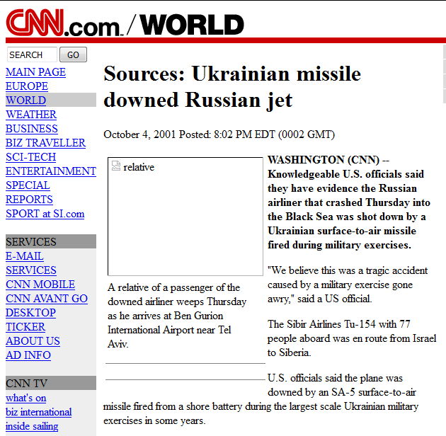 А телекомпания CNN со ссылкой на представителей администрации США также  сообщила, что имеются "убедительные доказательства", что самолёт Ту-154 был сбит ракетой украинского зенитно-ракетного комплекса "SA-5" (то есть С-200), выпущенной во время военных учений:
