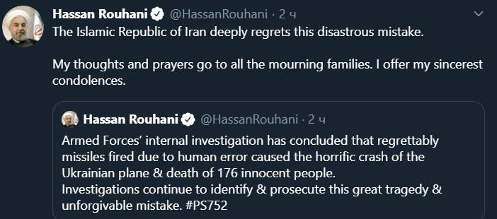 Поначалу Иран отрицал свою вину и говорил о технической неисправности. Затем президент Ирана Хассан Рухани назвал произошедшее "непростительной ошибкой" и пообещал выплатить компенсации семьям погибших. Но при этом отметил, что ситуацию спровоцировали США: