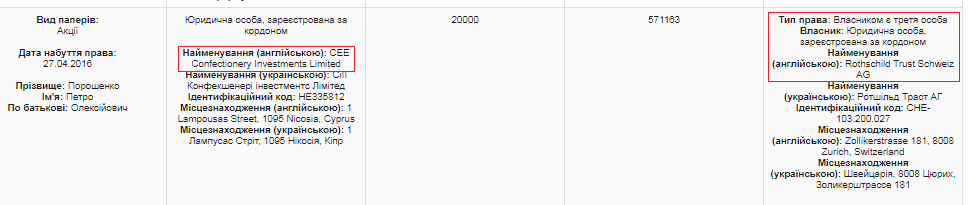 В своей декларации за 2016 год Петр  Порошенко утверждал, что "Ротшильд траст" являлся собственником акций кипрской компании, что дало пиарщикам Порошенко основание говорить, что он избавился от своего бизнеса: