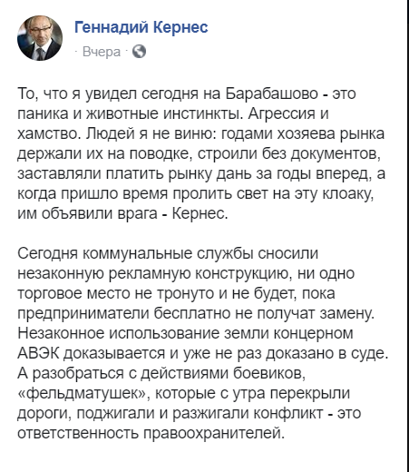 Позже на своей странице в Фейсбуке Кернес написал: "То, что я увидел сегодня на Барабашово - это паника и животные инстинкты. Агрессия и хамство. Людей я не виню: годами хозяева рынка держали их на поводке, строили без документов, заставляли платить рынку дань за годы вперед, а когда пришло время пролить свет на эту клоаку, им объявили врага — Кернес. Сегодня коммунальные службы сносили незаконную рекламную конструкцию, ни одно торговое место не тронуто и не будет, пока предприниматели бесплатно не получат замену. Незаконное использование земли концерном АВЭК (принадлежит Фельдману — Ред.) доказывается и уже не раз доказано в суде. А разобраться с действиями боевиков, “фельдматушек”, которые с утра перекрыли дороги, поджигали и разжигали конфликт - это ответственность правоохранителей”.