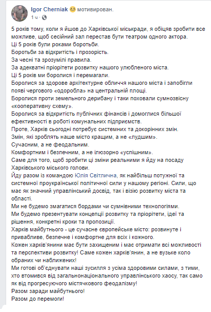 При этом ходят разноречивые слухи о намерениях самой Светличной участвовать в выборах мэра Харькова.