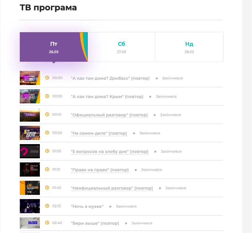 Конечно, в эфире поднимаются темы, напрямую касающихся Крыма и Донбасса - например, одна из последних передач посвящена помощи абитуриентам с неподконтрольных территорий при поступлении в украинские вузы. Но такие узкие прикладные вещи появляются в эфире скорее в качестве исключения. А почти половину эфирного времени занимают повторы старых передач, фильмов и сериалов, которые все желающие давно уже посмотрели по другим телеканалам.