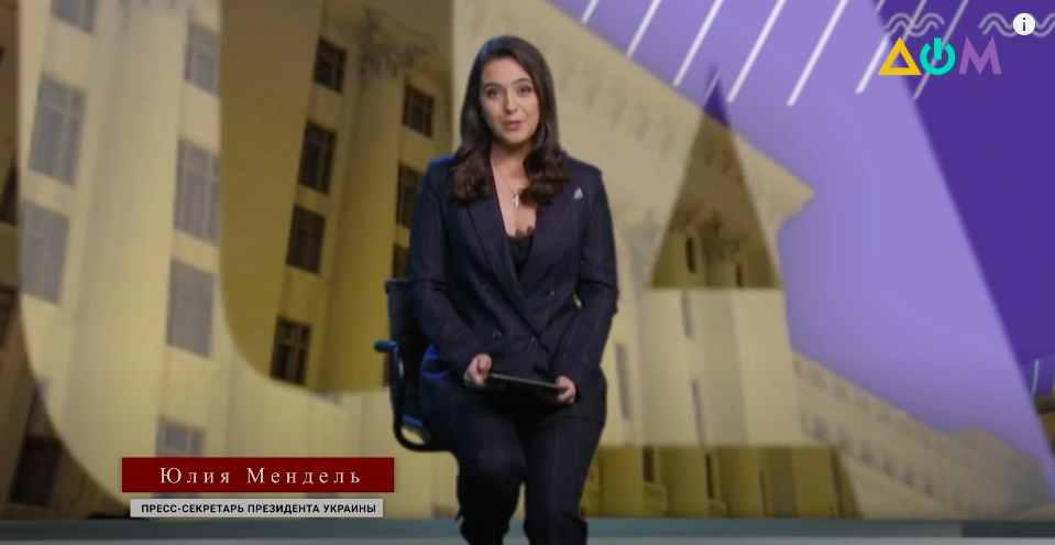 Студия в фиолетовых тонах. Ведущая - пресс-секретарь президента Зеленского, Юлия Мендель. Она - госслужащий Украины, но в эфире говорит по-русски. Это было бы невозможно на любом украинском телеканале. Но возможно на канале "Дом".