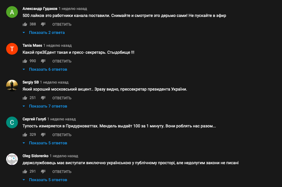 Примечательно, что, несмотря на хайп вокруг появления пресс-секретаря президента на госканале (об этом писали все ведущие СМИ), первый эфир Мендель на Ютубе посмотрело 69 тысяч человек. Зато ее выступление собрало более 18 тысяч дизлайков и всего 900 лайков. А также множество негативных комментариев.