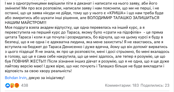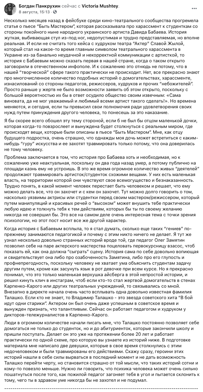 История второй пострадавшей от домогательств Талашко. Скриншот из Фейсбука Богдана Панкрухина