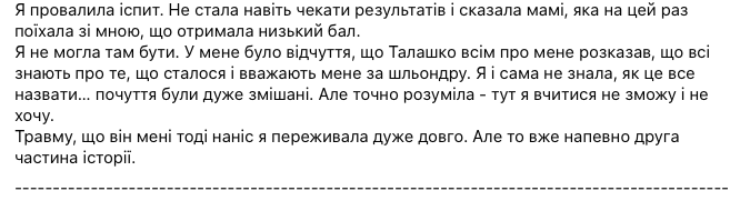 "В этом году Талашко собирался набрать новый курс, а ему уже 75 лет и его отклонения могут прогрессировать. Этому в основном подвержены абитуриентки – максимально незащищённые девочки, часто приезжие из других городов, у которых здесь нет семьи, друзей и поддержки. Я сначала хотела рассказать о домогательствах Талашко анонимно, но узнав историю Юлии Бирзул, с которой это произошло в 15 лет, я решила, что готова говорить об этом открыто. Потому что про какие-то анонимные истории очень легко сказать, что это выдумка. Хотя мне крайне не хотелось это подкреплять своим именем, потому что это неприятный пиар для меня и для моей семьи. Но факт того, что это продолжается до сих пор… Если я так легко отделалась, это не значит, что у других девушек получится", – отметила в комментарии "Стране" Виктория Муштей.