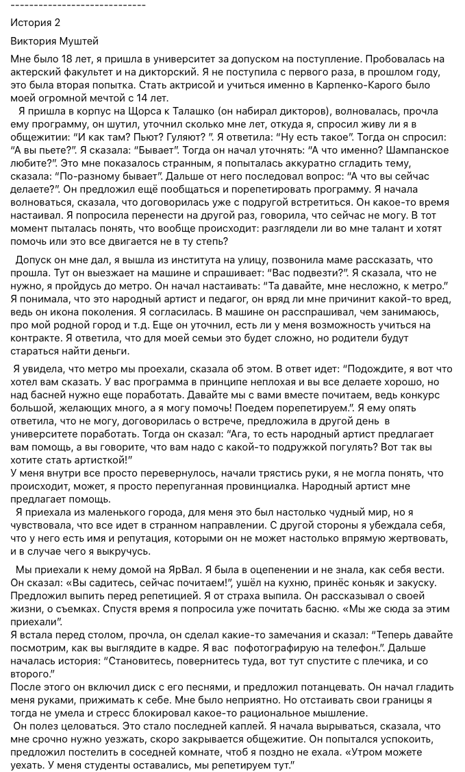 После обнародования первых двух историй о домогательствах Талашко с именами пострадавших девушек, публично высказались в их поддержку и другие выпускницы Карпенко-Карого.