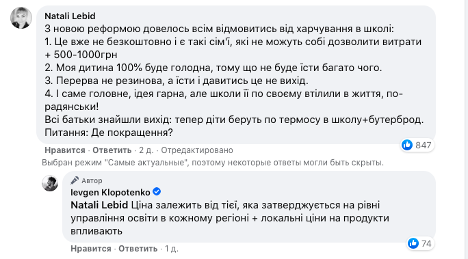 Многие родители в комментариях советуют Клопотенко самому есть свои блюда и “перестать издеваться над детьми”. Или же начинать такую реформу не с садиков и школ, а с Верховной Рады.