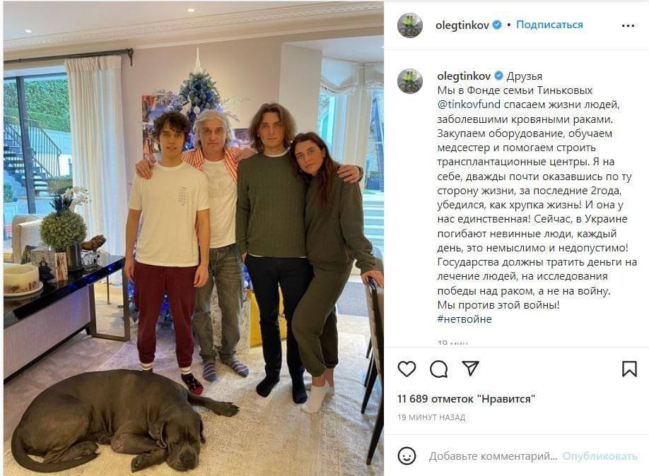 "Мы в Фонде семьи Тиньковых спасаем жизни людей, заболевших кровяными раками. Закупаем оборудование, обучаем медсестер и помогаем строить трансплантационные центры. Я на себе, дважды почти оказавшись по ту сторону жизни, за последние 2 года, убедился, как хрупка жизнь! И она у нас единственная! Сейчас, в Украине погибают невинные люди, каждый день, это немыслимо и недопустимо! Государства должны тратить деньги на лечение людей, на исследования победы над раком, а не на войну. Мы против этой войны!", - заявил он.