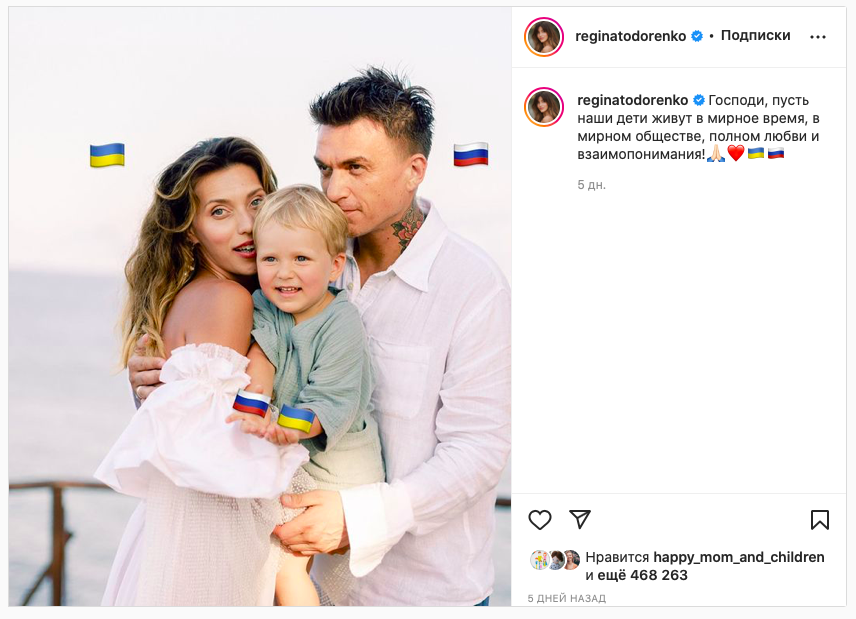 Украинка Регина Тодоренко, ведущая программы "Орел и решка", запостила "примирительное" фото, где разместила флаг Украины возле себя, флаг России возле своего мужа, российского певца Влада Топалова, и оба флага - возле их сына. Она призвала к миру, но войну не осудила: "Господи, пусть наши дети живут в мирное время, в мирном обществе, полном любви и взаимопонимания!". Комментарии к этому посту она закрыла.