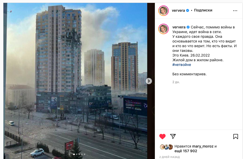 Уроженка Украины Вера Брежнева, экс-солистка группы "ВИА Гра" и певица, с первого дня войны осуждает действия России и призывает остановить военные действия, публикуя фото разрушенных в результате обстрелов домов мирных жителей. Она также активно освещает последствия бомбежек в Украине в своих сторис в Инстаграм.