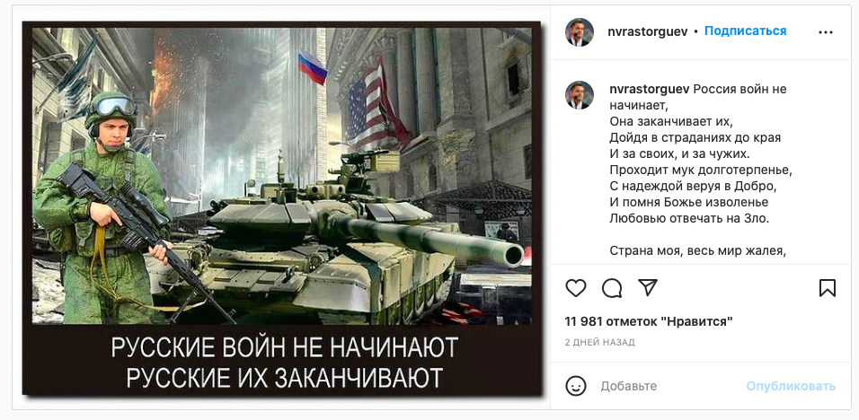 Несколько дней не была до конца ясна позиция Николая Расторгуева - любимого певца Путина, солиста группы "Любэ". В первый день войны он выложил в сторис в Инстаграм картинку с призывом "Давай за мир", но больше ничего не написал.