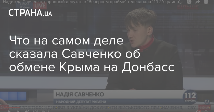 "Надежда Савченко предлагает сдать Крым в обмен на Донбасс" – с такими заголовками ряд СМИ опубликовали заявление народного депутата, сделанное в эфире канала 112.Украина. В СБУ мгновенно пообещали дать правовую оценку высказываниям Савченко.