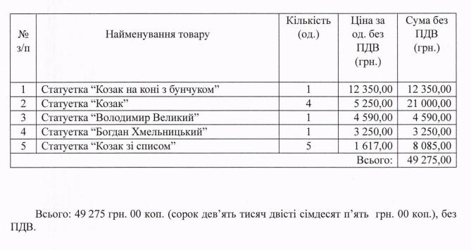 За 15 тысяч гривен для парламента закупят бронзовую статуэтку "Лев и козак". А еще один набор статуэток для подарков (скульптуры козаков, Богдана Хмельницкого и Владимира Великого) обойдется в 50 тысяч гривен.