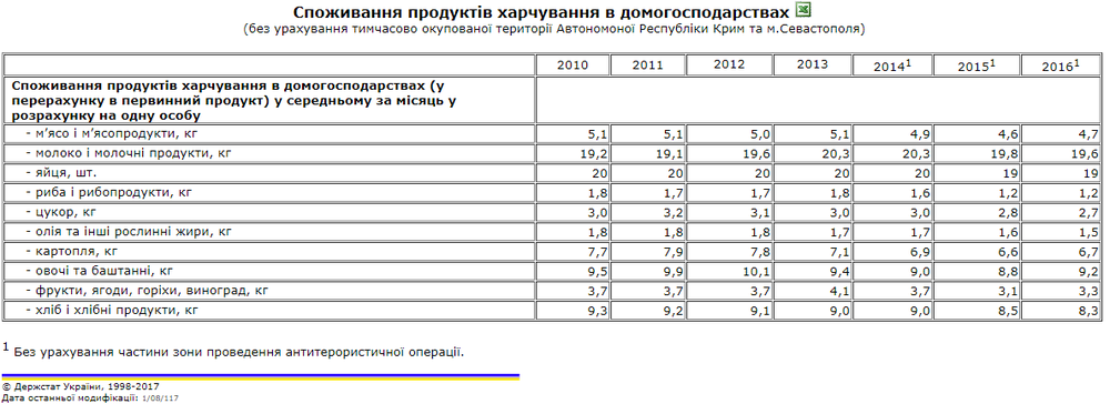 При этом, если сравнить данные за 2016 год с предыдущими, потребление продуктов питания в украинских домохозяйствах с годами не растет, а только снижается. Например, с 2010 по 2014 год украинцы позволяли себе на 1 кг яиц в месяц больше, чем сейчас. А потребление мяса упало с 5,1 килограмма на человека до 4,7. Меньше стали есть и фруктов, рыбы, картошки, сахара. И лишь потребление молочных продуктов немного выросло.