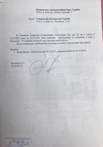 На обнародованном Розенблатом документе действительно присутствует входной штемпель Антикоррупционного бюро. Но что интересно - сведения о своем вояже нардеп подал в НАБУ аккурат в день вылета. Хотя и приложил к нему копии заранее купленных обратных билетов.