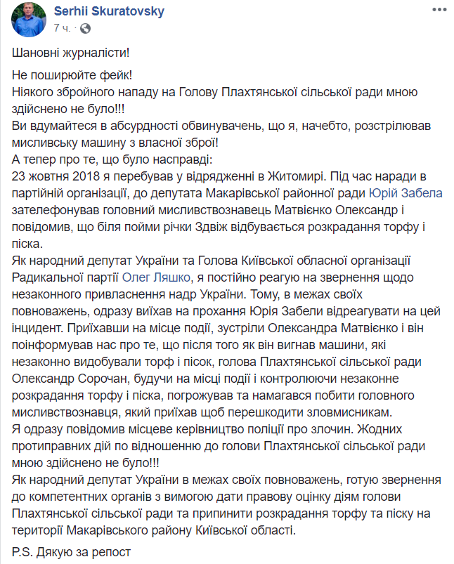 В его интерпретации, 23 октября в ходе пребывания его в командировке на Житомирщине его коллеге по Радикальной партии Юрию Забеле позвонил егерь Александр Матвиенко, который рассказал, что у поймы реки Здвиж происходит разворовывание торфа и песка.