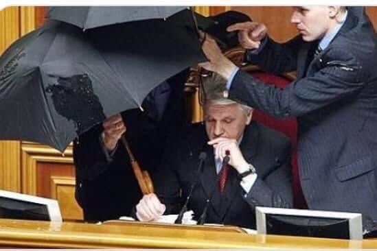 В день голосования за "Харьковские соглашения" спикера Владимира Литвина забросали яйцами. От "снарядов" его закрывали зонтами