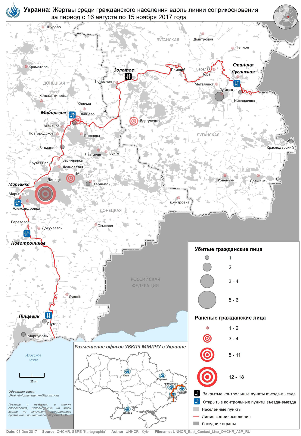 За период с 16 августа по 15 ноября 2017 года миссия зафиксировала 87 жертв среди гражданского населения, из них 15 убитых и 72 раненых:
