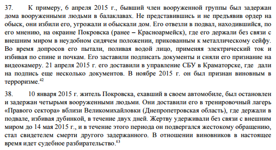 А другой житель Покровска, ехавший в своем автомобиле, был остановлен и задержан четырьмя вооруженными людьми. Они доставили его в тренировочный лагерь "Правого сектора" вблизи Великомихайловки (Днепропетровская область), где его держали в подвале, избивая дубинкой, в течение двух дней. Жертву удерживали без связи с внешним миром всего пять месяцев, в течение которых он подвергался жестокому обращению, и даже стал свидетелем смерти другого задержанного: