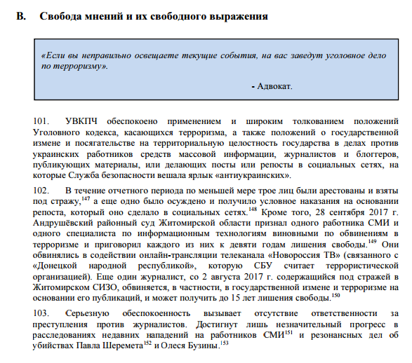 Дважды в докладе миссии ООН упоминается приговор Андрушевского районного суда Житомирской области от 28 сентября 2017 года, которым к девяти годам лишения свободы были осуждены журналисты Василец и Тимонин.
