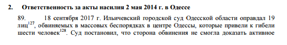 Относительно расследования трагедии в Одессе 2 мая 2014 года, когда в стычках на улицах города и при пожаре в Доме профсоюзов погибли 48 человек, миссия ООН констатировала, что на сегодняшний день никто не привлечен к ответственности ни за акты насилия в тот день, ни за гибель кого-либо из 48 человек, ставшей их результатом.