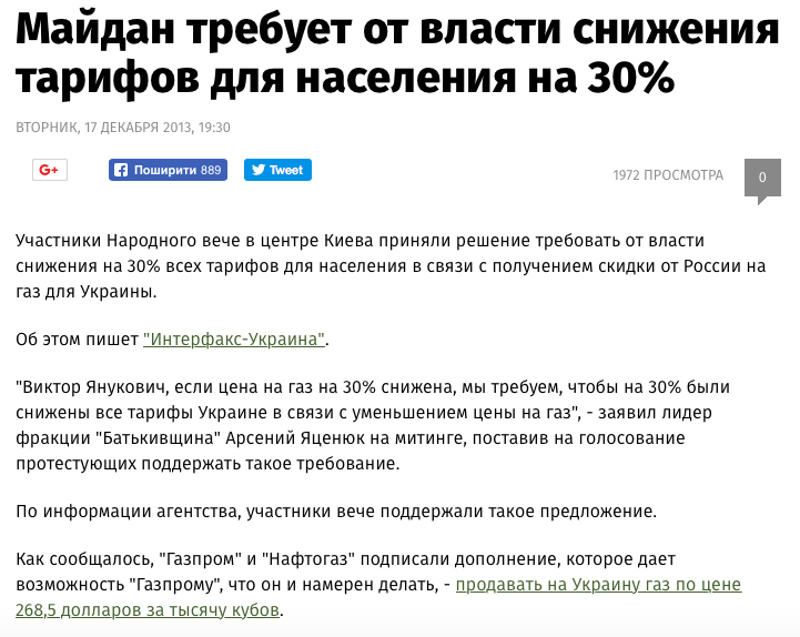 Во-первых, газ по 268,5 доллара за тысячу кубометров – вне зависимости от роста мировых цен (на тот момент по договору 2009 года Украина получала газ по 410-420 долларов, а без учета "харьковской" скидки – по 510-520 долларов).