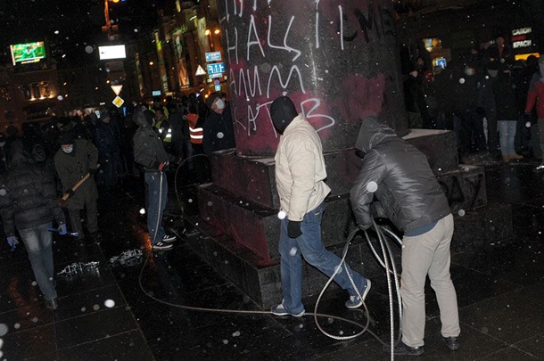 Памятник на Бессарабской площади протестующие хотели снести еще 1 декабря, но тогда "Беркут" стал плотным кольцом и не позволил это сделать. Однако в следующее воскресенье, 8 декабря, силовики таинственным образом исчезли, и уже никто не мешал "свободовцам" повалить Ленина.