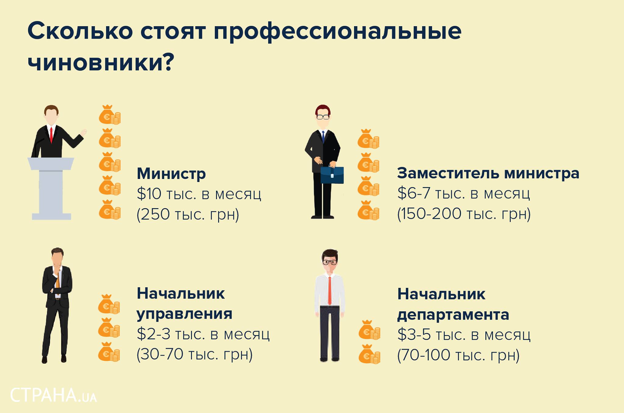 Топ-чиновники, министры должны получать до 10 тысяч долларов (250 тысяч грн) в месяц. Для уровня зама – 6-7 тысяч долларов (150-200 тысяч грн). Для уровня начальника департамента – 3-5 тысяч долларов (70-100 тысяч грн). Начальники управления, чиновники среднего звена должны получать оклад 2-3 тысячи долларов (30-70 тысяч грн) в месяц.