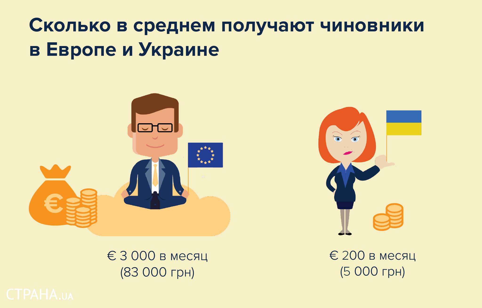 С 1 мая этого года всем украинским бюджетникам, в том числе и чиновникам, повысили оклады. Чуть-чуть — на 10%. Следующее такое же повышение произойдет в декабре. Впрочем, такими темпами до европейского уровня зарплаты еще долго не дорастут. Сейчас украинские госслужащие даже после майского повышения, по данным Госстата, получают в среднем меньше 200 евро (около 5 тысяч грн) в месяц, в то время как в Европе — 3 тысячи евро (почти 83 тысячи грн).