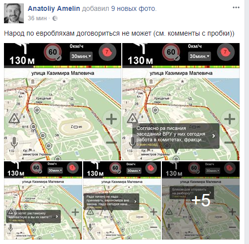 Анатолий Амелин, бизнесмен и супруг депутата Елены Сотник, выставил фото пробок на карте вместе с комментариями людей, которые ссорятся из-за "акции  на бляхах". На один комментарий в поддержку владельцев еврономеров приходится десять злобных пожеланий попасть под пресс.