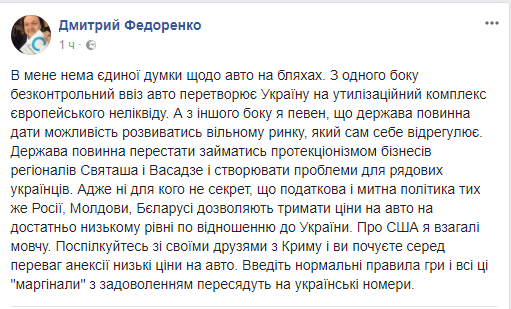 "З одного боку безконтрольний ввіз авто перетворює Україну на утилізаційний комплекс європейського неліквіду. А з іншого боку я певен, що держава повинна дати можливість розвиватись вільному ринку, який сам себе відрегулює. Держава повинна перестати займатись протекціонізмом бізнесів регіоналів Святаша і Васадзе і створювати проблеми для рядових українців. Адже ні для кого не секрет, що податкова і митна політика тих же Росії, Молдови, Бєларусі дозволяють тримати ціни на авто на достатньо низькому рівні по відношенню до України. Про США я взагалі мовчу... Введіть нормальні правила гри і всі ці "маргінали" з задоволенням пересядуть на українські номери".