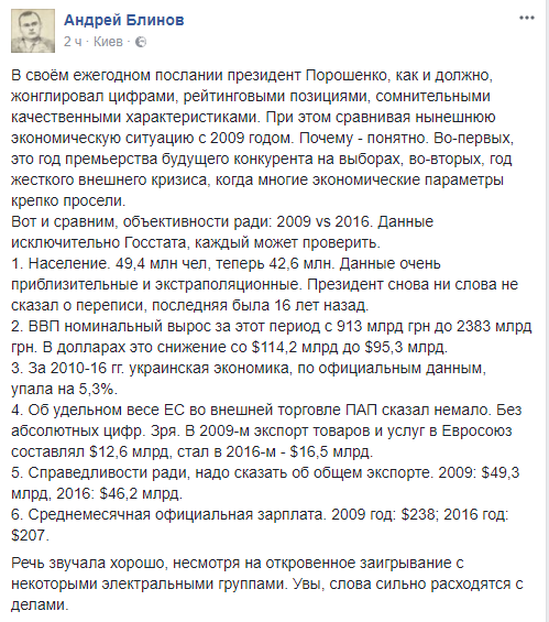 "В своём ежегодном послании президент Порошенко, как и должно, жонглировал цифрами, рейтинговыми позициями, сомнительными качественными характеристиками. При этом сравнивая нынешнюю экономическую ситуацию с 2009 годом. Почему - понятно. Во-первых, это год премьерства будущего конкурента на выборах, во-вторых, год жесткого внешнего кризиса, когда многие экономические параметры крепко просели.