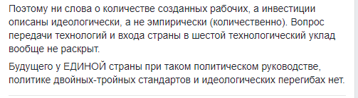 Поэтому ни слова о количестве созданных рабочих, а инвестиции описаны идеологически, а не эмпирически (количественно). Вопрос передачи технологий и входа страны в шестой технологический уклад вообще не раскрыт", – подытожил Блинов.