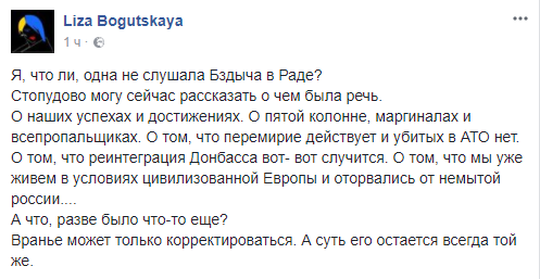 О наших успехах и достижениях. О пятой колонне, маргиналах и всепропальщиках. О том, что перемирие действует и убитых в АТО нет. О том, что реинтеграция Донбасса вот- вот случится. О том, что мы уже живем в условиях цивилизованной Европы и оторвались от немытой россии... А что, разве было что-то еще? Вранье может только корректироваться. А суть его остается всегда той же", – написала Богуцкая.