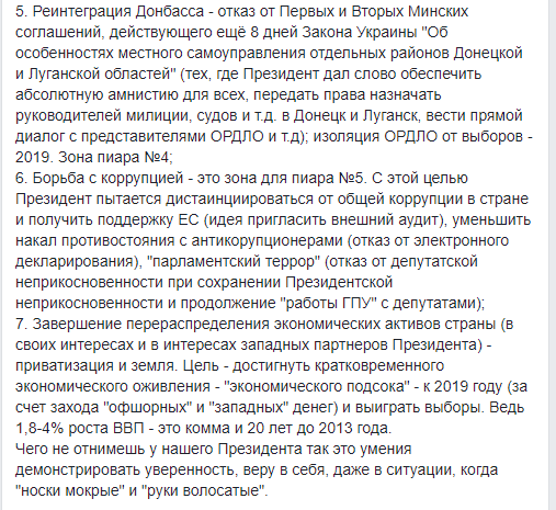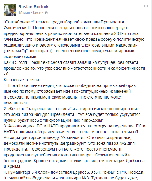 "Фактически П. Порошенко сегодня провозгласил свою первую предвыборную речь в рамках избирательной кампании 2019-го года. Очевидно, что Президент начинает свою предвыборную политическую радикализацию и работу с ключевыми электоральными маркерами (точками "g" электората) - внешнеполитическими, гуманитарными, экономическими. Как и 3 года Президент снова ставит задачи на будущее, без ответа прошлое - за то, что уже сделано - ответственности и самокритичности – 0", – считает эксперт и выделяет ключевые тезисы выступления президента. "Чего не отнимешь у нашего Президента так это умения демонстрировать уверенность, веру в себя, даже в ситуации, когда "носки мокрые" и "руки волосатые", - резюмирует Бортник.