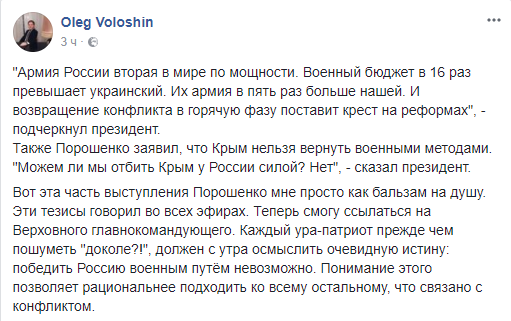 "Порошенко заявил, что Крым нельзя вернуть военными методами. "Можем ли мы отбить Крым у России силой? Нет", - сказал президент. Вот эта часть выступления Порошенко мне просто как бальзам на душу. Эти тезисы говорил во всех эфирах. Теперь смогу ссылаться на Верховного главнокомандующего. Каждый ура-патриот прежде чем пошуметь "доколе?!", должен с утра осмыслить очевидную истину: победить Россию военным путём невозможно. Понимание этого позволяет рациональнее подходить ко всему остальному, что связано с конфликтом", - написал Волошин.