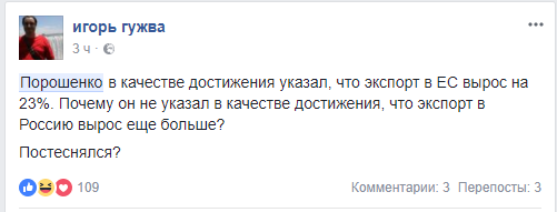 Главный редактор издания "Страна.ua" Игорь Гужва подметил: "Порошенко в качестве достижения указал, что экспорт в ЕС вырос на 23%. Почему он не указал в качестве достижения, что экспорт в Россию вырос еще больше? Постеснялся?"