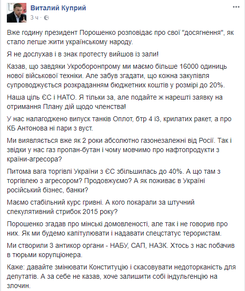 Внефракционный нардеп Виталий Куприй, который в момент выступления Порошенко находился в Верховной Раде, признался, что не дослушал речь и "в знак протеста вышел из зала".