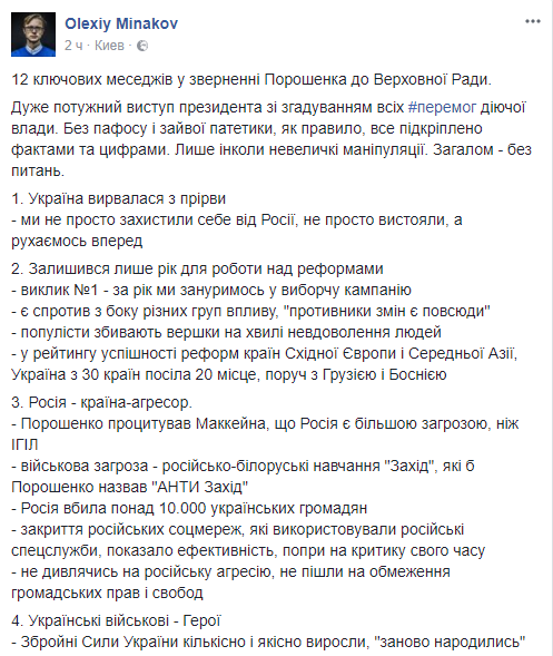 Например, блогера и политического обозревателя Алексея Минакова. Он выделил целых 12 ключевых месседжей из обращения Порошенка к Верховной Раде. А само выступление назвал "мощным".