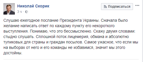 Нардеп от Оппозиционного блока Николай Скорик так описал свои эмоции от прослушивания ежегодного послания Президента Украины: "Сначала было желание написать ответ по каждому пункту его некороткого выступления. Понимаю, что это бессмысленно. Скажу двумя словами: стыдно слушать. Сплошной поток лицемерия, обмана и абсолютно тупиковых для страны и граждан посылов. Самое ужасное, что если мы на выборах от него и его команды не избавимся, значит мы этого достойны", - написал Скорик.