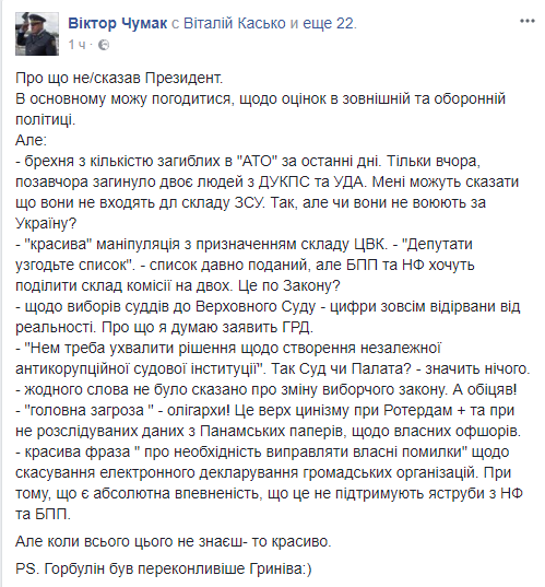 PS. Горбулін був переконливіше Гриніва", - подметил Чумак, намекая на политтехнолога Грынива, который, по слухам, и пишет речи президенту.