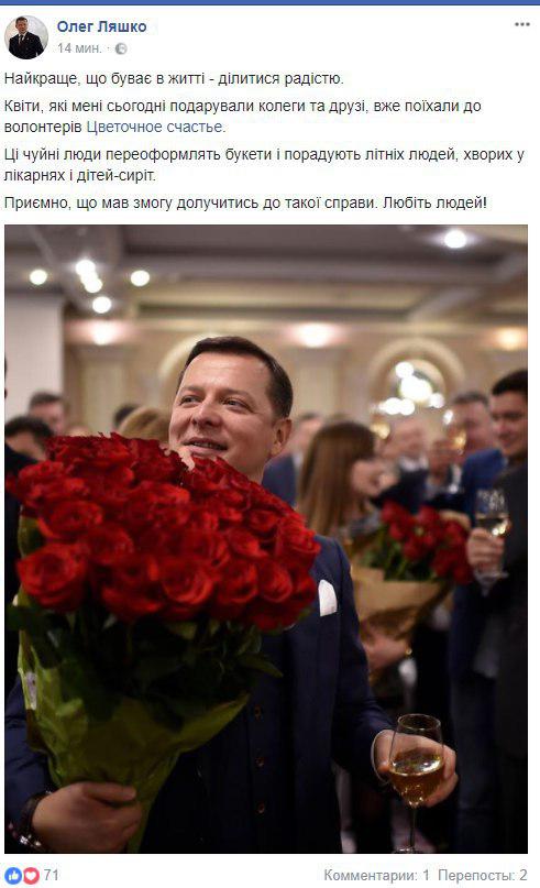 Сам Ляшко выложил в свою социальную сеть фотографию с огромной охапкой цветов, но через некоторое время ее поменял на снимок из салона автомобиля, заваленного цветами.