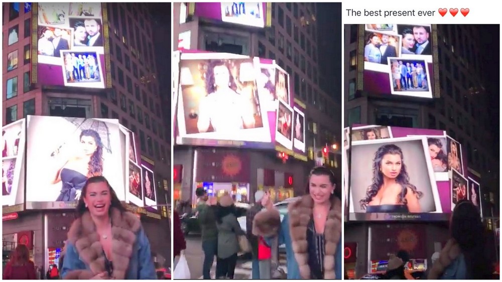 Стоимость подарка получилась не менее $3000. Чтобы разместить фото на бигборде Таймс-сквер, надо выложить минимум $1500. Несколько экранов со слайд-шоу может стоить около $3 тысяч, в зависимости от времени трансляции, сообщает ТаблоID.