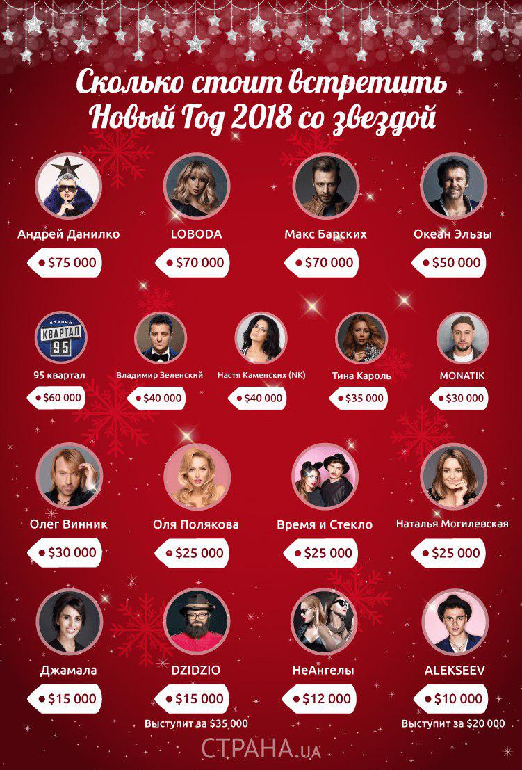 Что касается DZIDZIO, то, как рассказал "Стране" концертный директор Андрей Любый, выступление группы в обычный день стоит около $15 000. Ночь с 31 декабря на 1 января значительно дороже: "Новый год артисты встретят за городом на приватной вечеринке, где споют за $35 000".