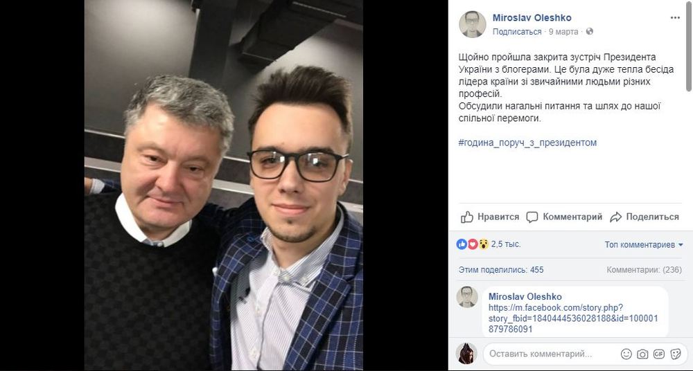 Об этом стало известно из поста одного из самых ярых поклонников президента – Мирослава Олешко. Он выложил совместное селфи с Петром Алексеевичем. Позже факт встречи подтвердили и остальные ее участники. Блогеры наполнили социальные сети потоками восхвалений и водопадами лести.