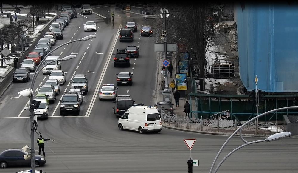 Фотокорреспонденты "Страны" увидели, как ради беспрепятственного проезда гаранта в самом центре города на улице Крещатик регулировщики около семи минут задерживали автомобильный поток.
