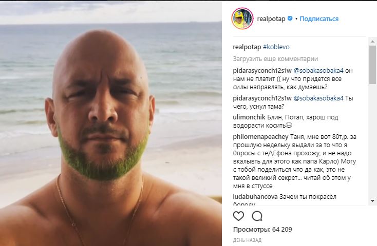 Отметим, что и сам Потап в свой фотоблог Instagram выложил снимок на фоне моря день назад и поставил хэштег #koblevo.