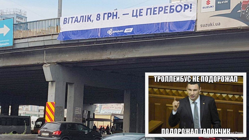 Киевляне встревожены и огорчены повышением цен на проезд в общественном транспорте. Сегодня по городу развесили горизонтальные баннеры, на которых написано: "Виталик, 8 грн – это перебор". Одна из таких надписей, адресованных мэру Виталию Кличко появилась на Крещатике. Чуть позже - на мосту Осокорков. Интересно, что внизу есть подпись – Демократический Альянс. Впрочем, в самой партии подобный перформанс пока что не подтвердили.
